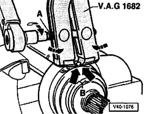 - Install VAG 1682 CV joint boot clamp tool, as shown in illustration. Ensure jaws of pliers seat in corners (arrow B) of clamp.