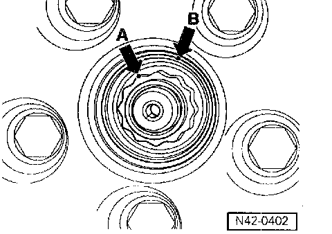 - Mark 2nd line (arrow B) on edge of wheel hub above point.
