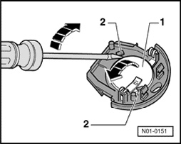 - Use a screwdriver to unclip upper battery - 1 - out of holders - 2 - in direction of - arrow -.