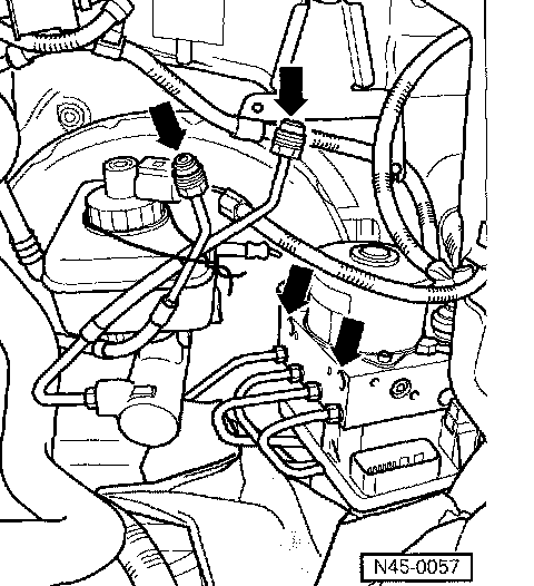 - Disconnect brake lines from hydraulic unit to brake master cylinder (arrows) and suspend with wire.