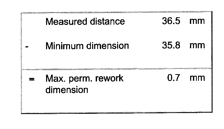 Measured distance minus minimum dimension = Maximum permissible reworking dimension.
