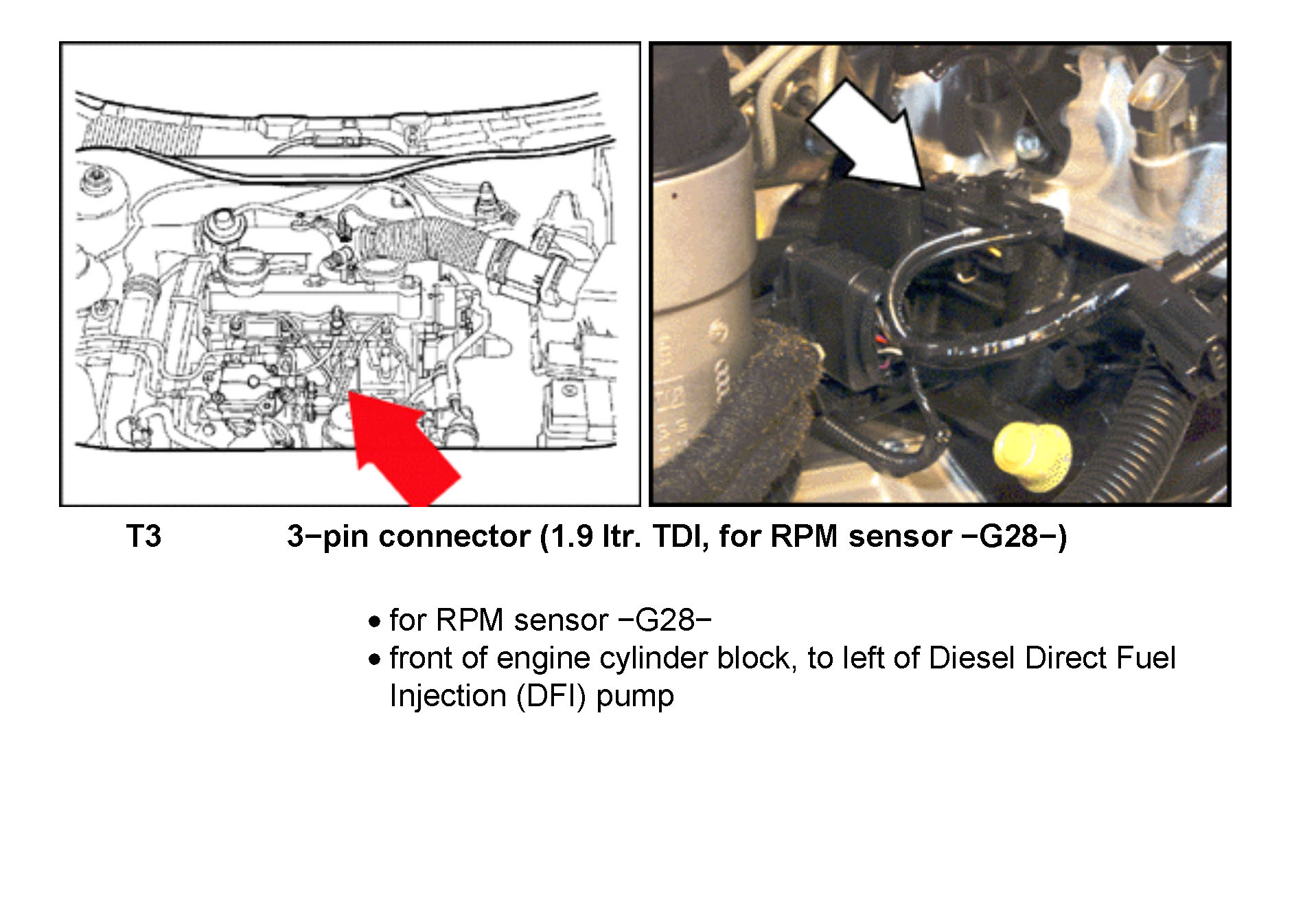 T3 - 3-pin connector (1.9 ltr. TDI, for RPM sensor -G28-)