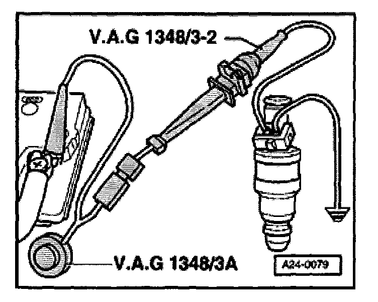 - Connect one contact of the injector to be tested to engine Ground using auxiliary cables from VAG 1594.