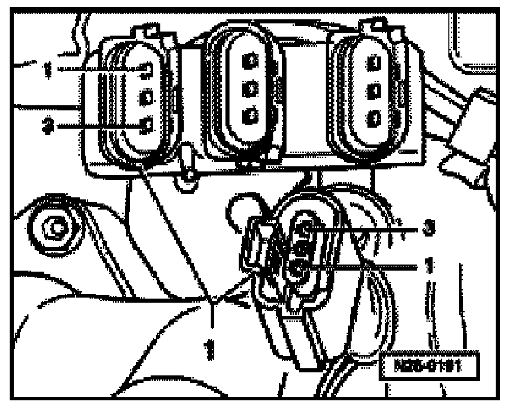 - Measure resistance between terminals 1 + 2, 1 + 3, and 2 + 3 at connectors to knock sensors.