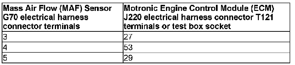 - Using a multimeter, check the Mass Air Flow (MAF) Sensor G70 electrical harness connector terminals to the Motronic Engine Control Module (ECM) J220 electrical harness connector T121 for an open circuit.