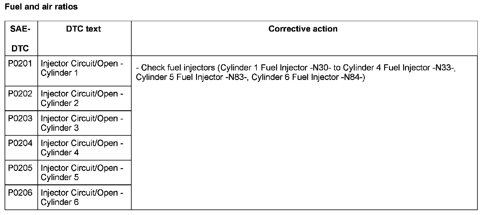 DTC P0201 - P0206: