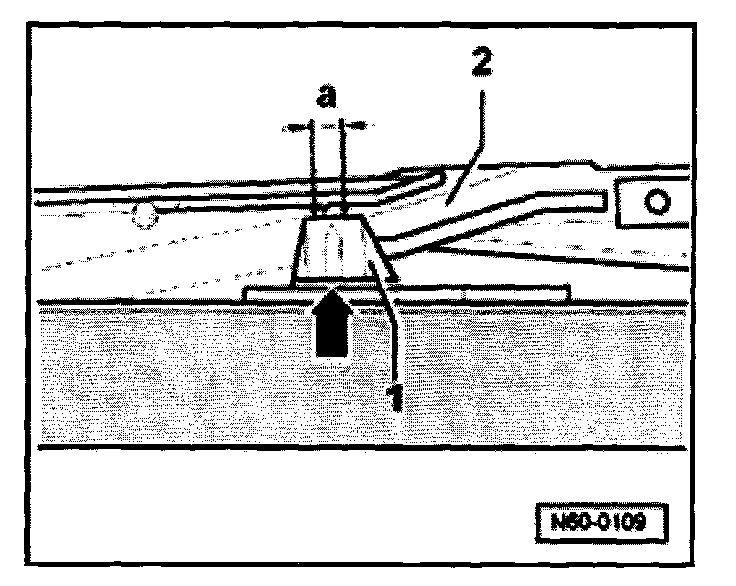 The mark (arrow) on the rear of the guide upper section -1- must, on both sides, lie within the marks -dimension a- on the guide rail -2-.
