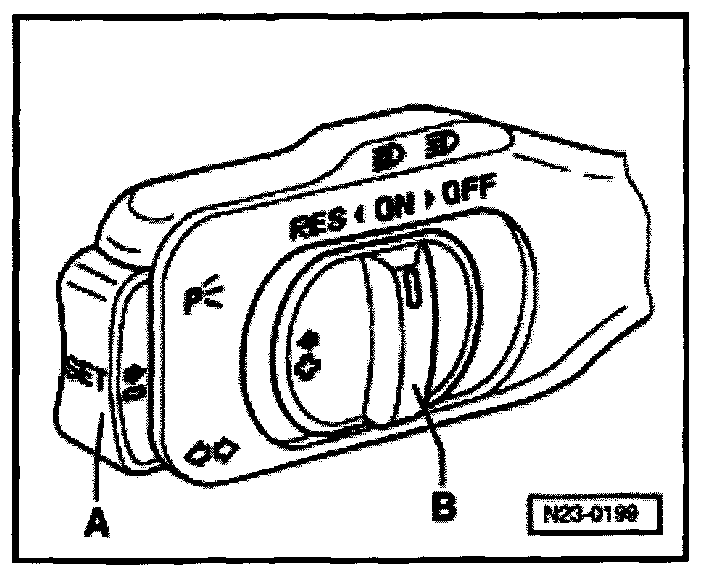 NOTE: On vehicles with an automatic transmission, the CCS switch will not be supplied with voltage until the vehicle speed exceeds 25 km/h (approx. 16 mph) and the selector lever is in position 2, 3 or D. Once the switch has been supplied with voltage it will also remain live at idle speed provided a driving range (except 1 or R) is selected.