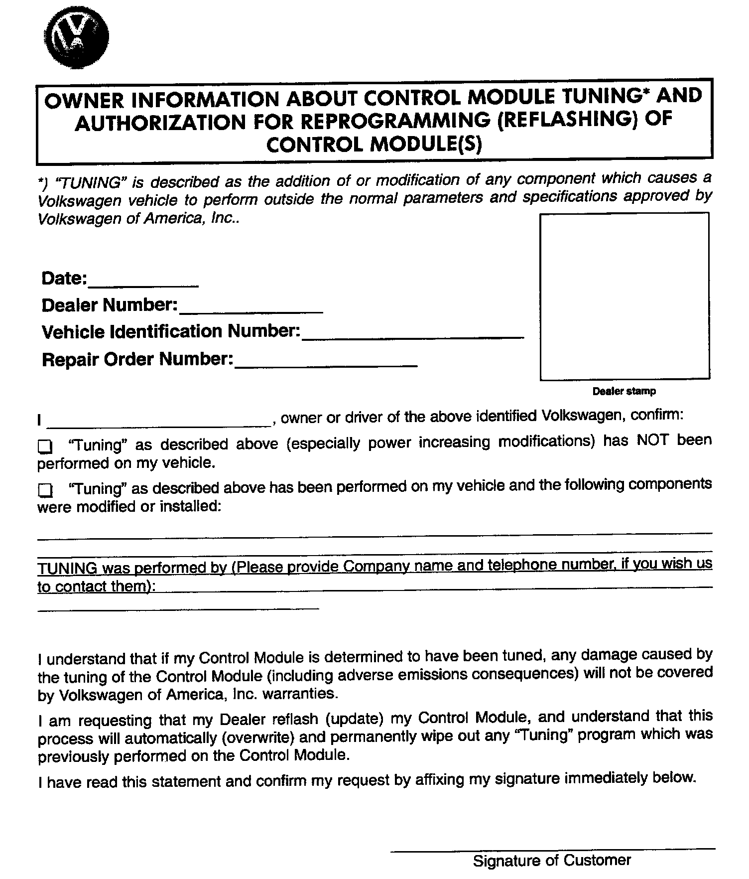 ^ Your Dealership should place the vehicle owner on notice in writing, that their ECM was found to have been tuned, and that any damage caused by the tuning of the ECM (including any adverse emissions consequences) will not be covered by Volkswagen of America, Inc. warranties.