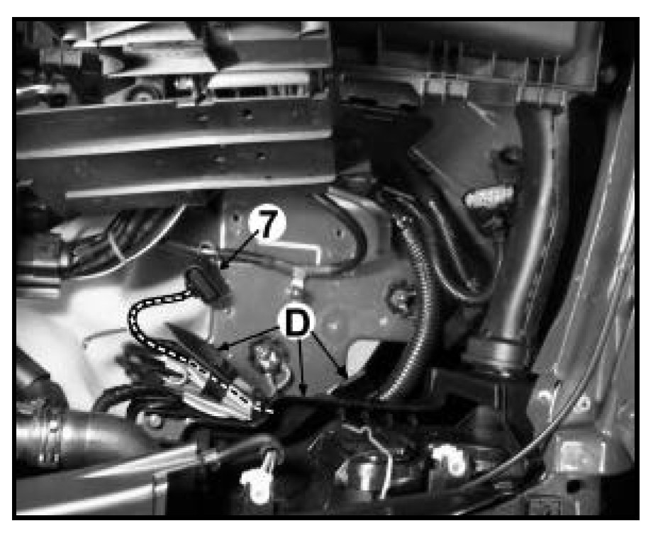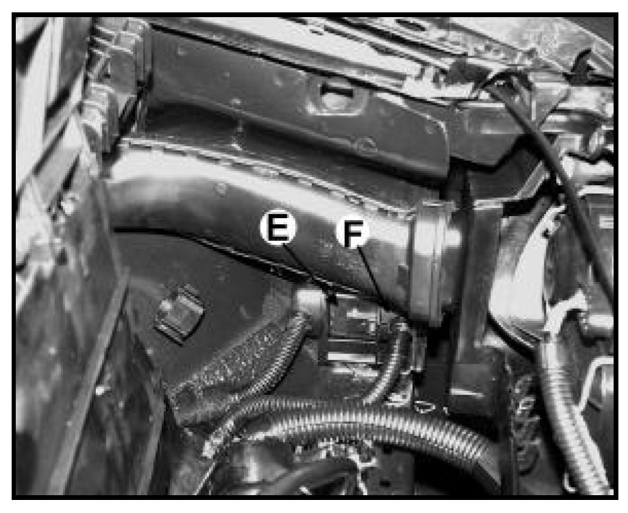 - Under the air intake tube, lift harness connector -E- up and roll it out of the holder