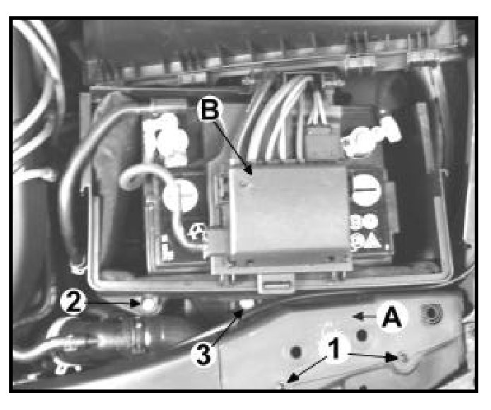 - Unsnap fuse box -B- from battery side cover, pull up and tie off Remove bolt -2-, unsnap battery side cover at both rear corners, pull up and remove battery side cover