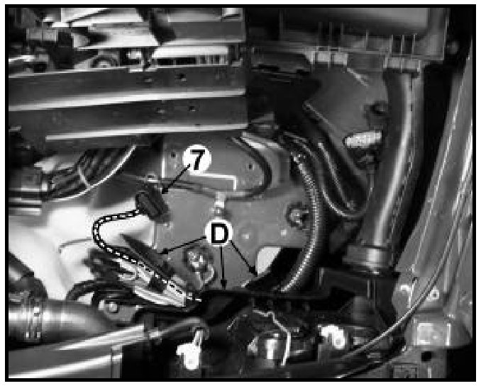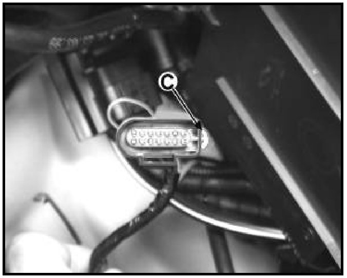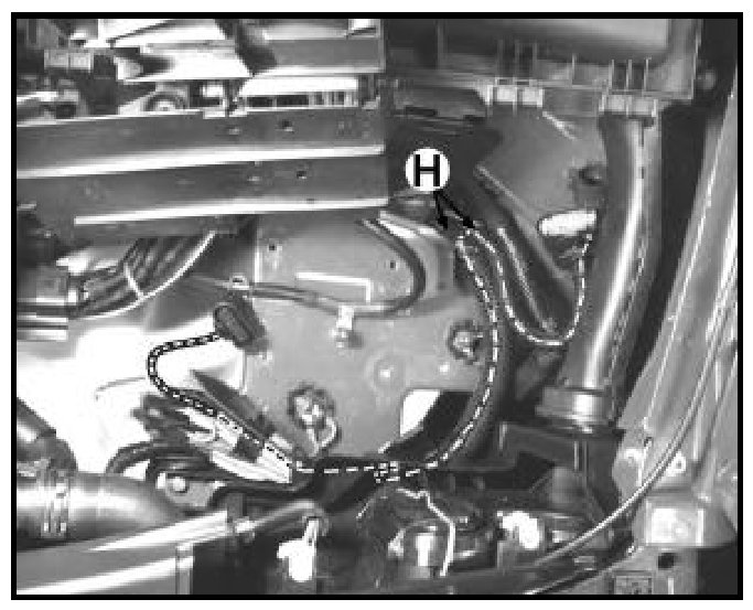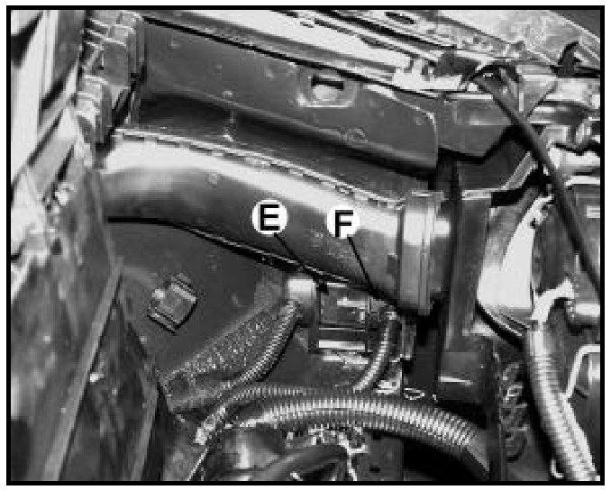 - Under the air intake tube, lift harness connector -E- up and roll it out of the holder