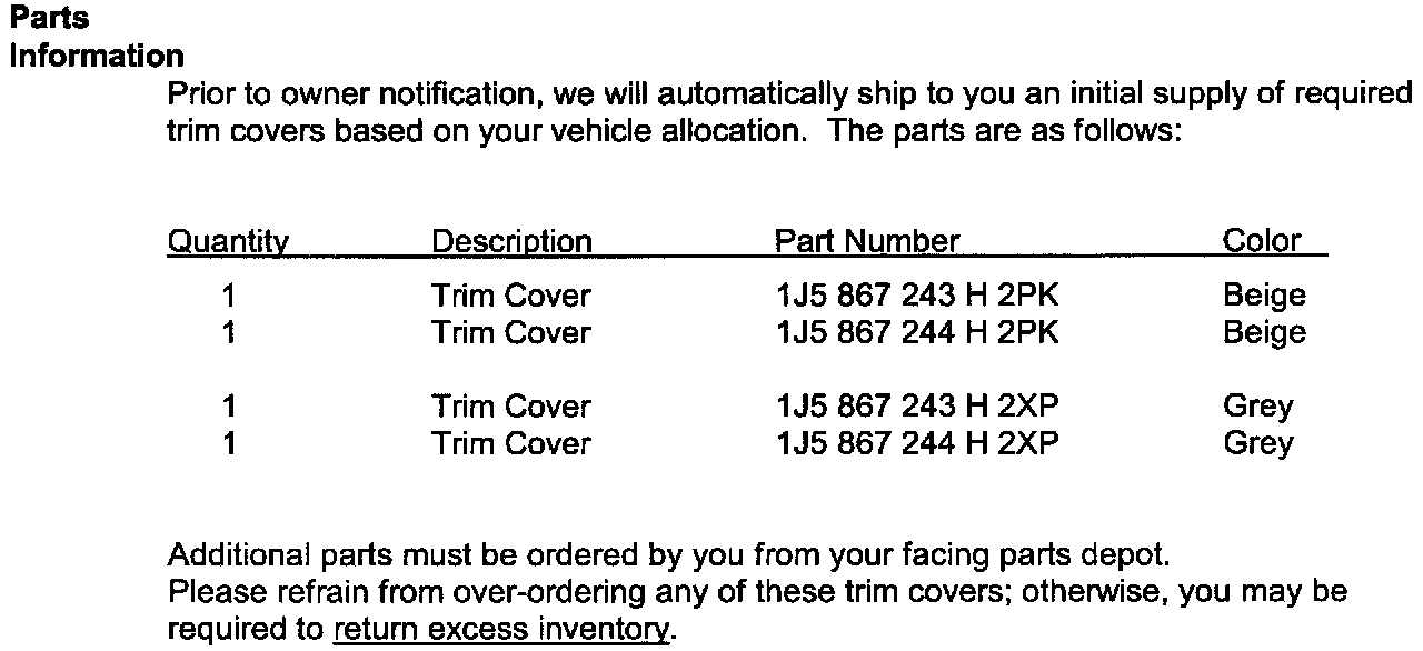 Volkswagen will not reimburse under this recall any duplicate recall repair work or a repair outside the VIN range.