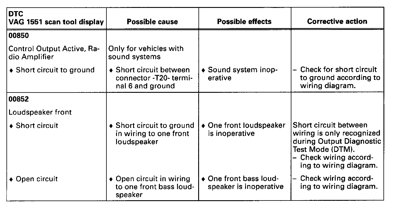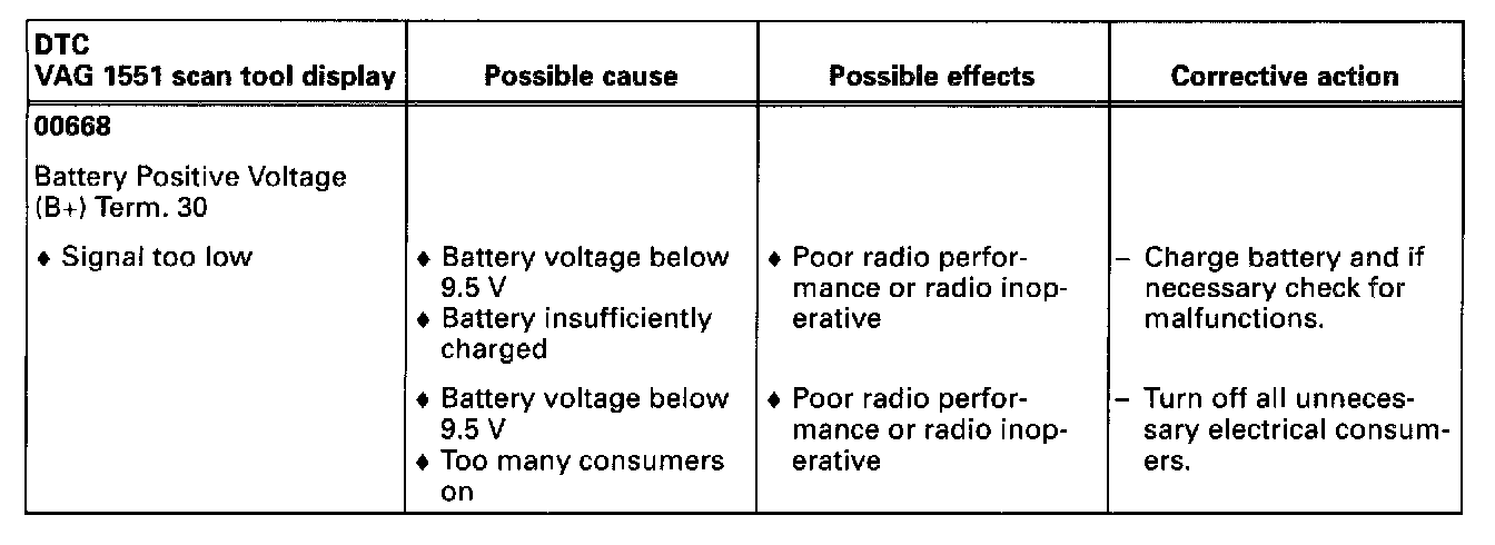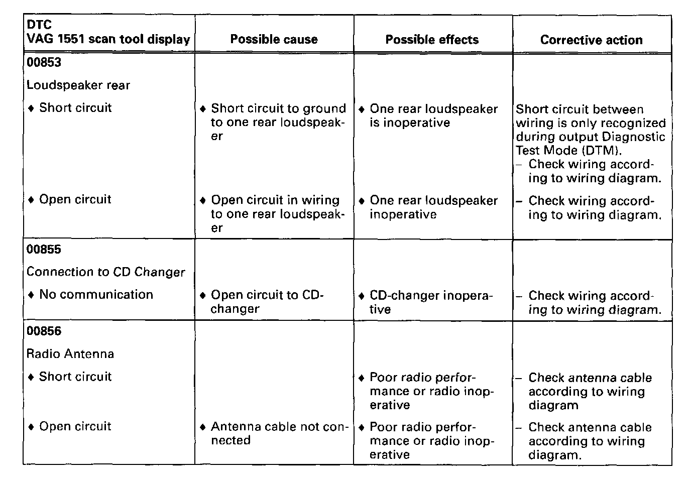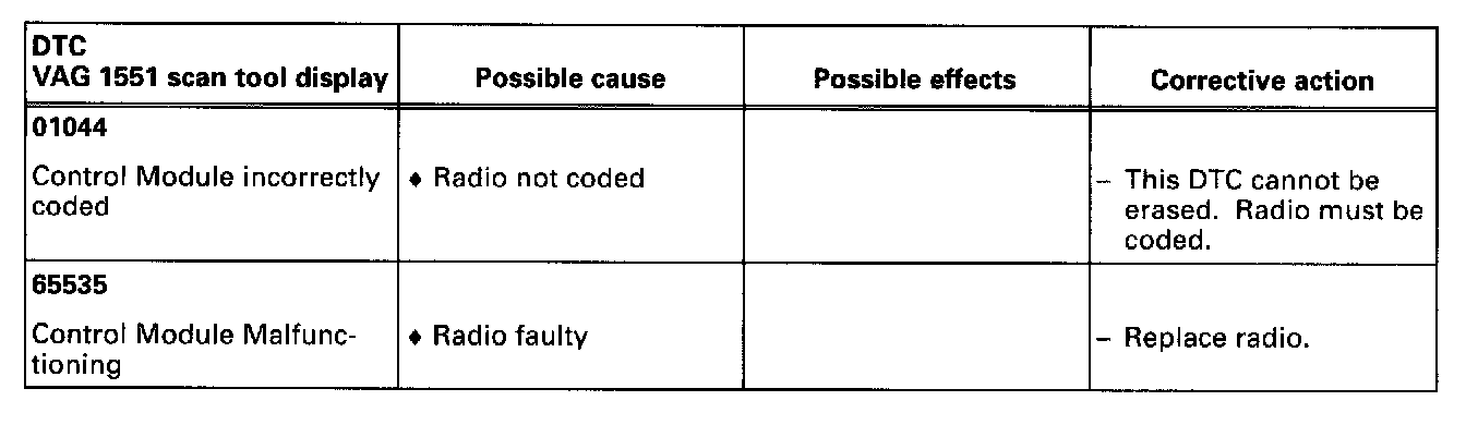 - The following table lists all the malfunction with the corresponding 5-digit code numbers, that can be recognized by the radio and printed out by the VAG1551 scan tool
