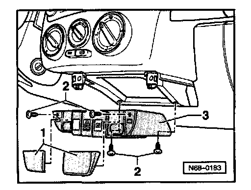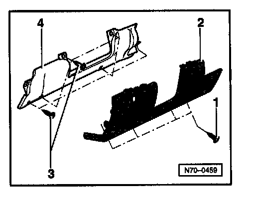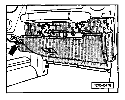 - Remove screw under cap (arrow) of glove box -1-.