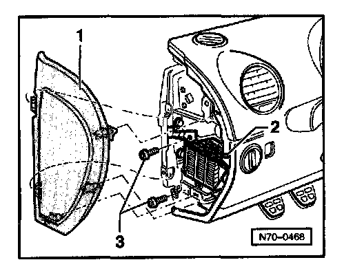 - Loosen right side cover -1- mounting clips -2- and remove cover from instrument panel.