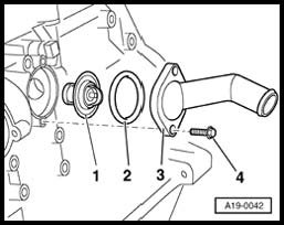 - Remove securing bolts - 4 - of connecting flange - 3 - and remove flange - 3 - with thermostat - 1 -.