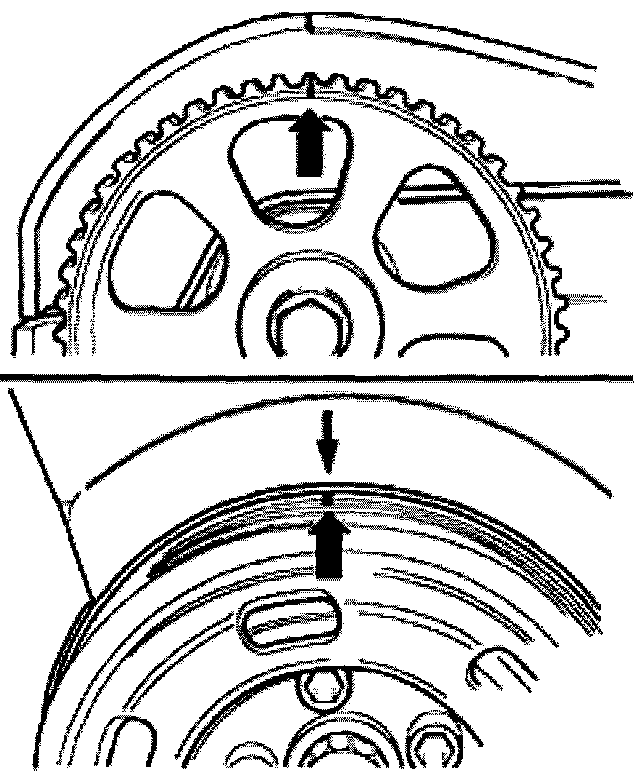 - Set camshaft sprocket to TDC No. 1 cylinder by turning crankshaft. Mark on camshaft sprocket must align with arrow on toothed belt guard.