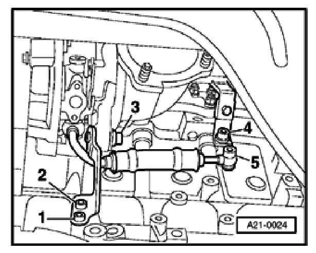 - Loosen bolts 1 and 2 at bracket for turbocharger approx. 2 revolutions in order to avoid tension when installing cylinder head.