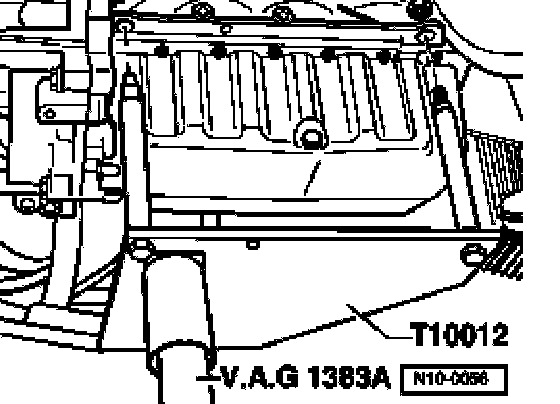 - Fit engine bracket T 10012 onto cylinder block with a securing nut and M10 X 25/8.8 bolt and tighten to approximately 40 Nm.
