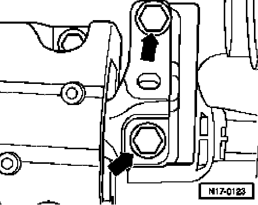 - Unbolt transmission side of assembly mount from transmission carrier at top -arrows-.