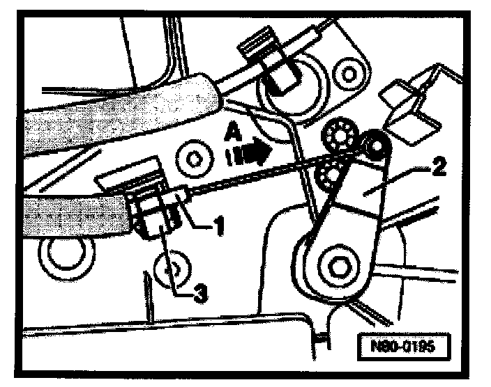 - Press footwell/defrost flap lever onto stop arrow -A- and attach outer cable -2- with clip -3-.