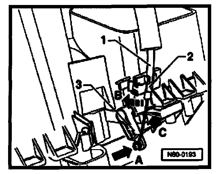 - Press footwell/defrost flap lever onto stop arrow -C- and attach outer cable -1- with clip -2-, arrow -B-.