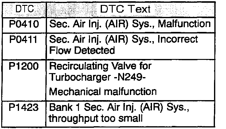 Malfunction Indicator light (MIL) ON, Diagnostic trouble code(s) (DTC)s P0410, P0411, P1200, or P1423 stored in DTC memory.