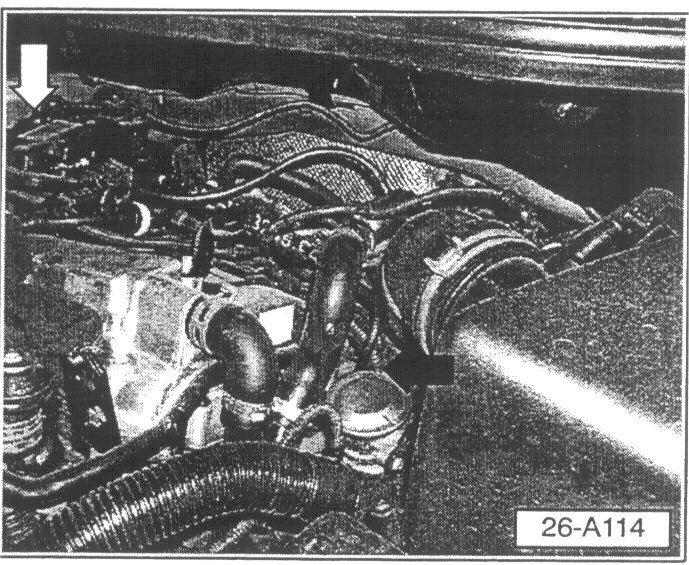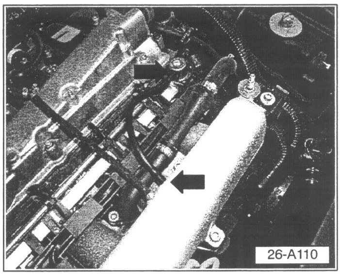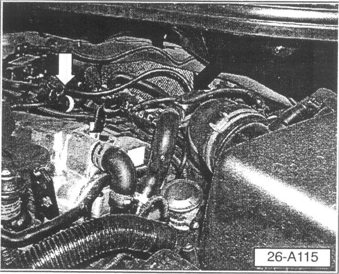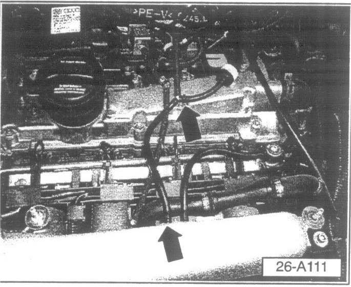 - Illustration shows new hose from intake port to fuel pressure regulator (black arrows).