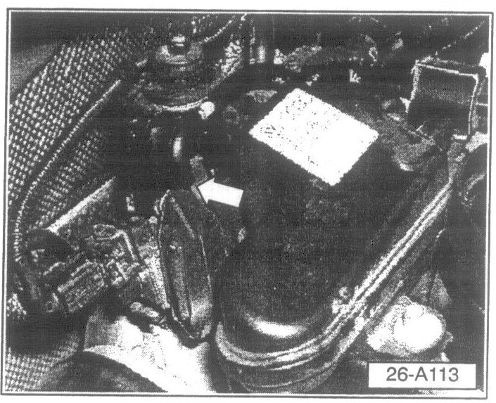 - Illustration shows new hose from (AIR) solenoid valve -N112- (white arrow) installed to Combination valve (black arrow).