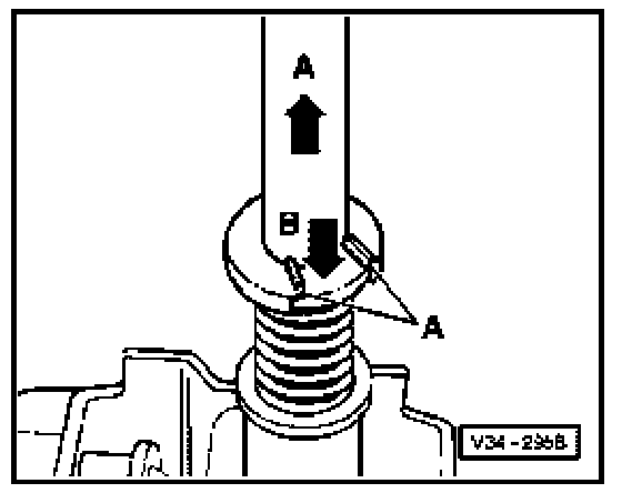 - To remove and install circlip pull gear lever in arrow direction -A- and at same time, with a screwdriver push down spacer bushing onto stop in arrow direction -B-.