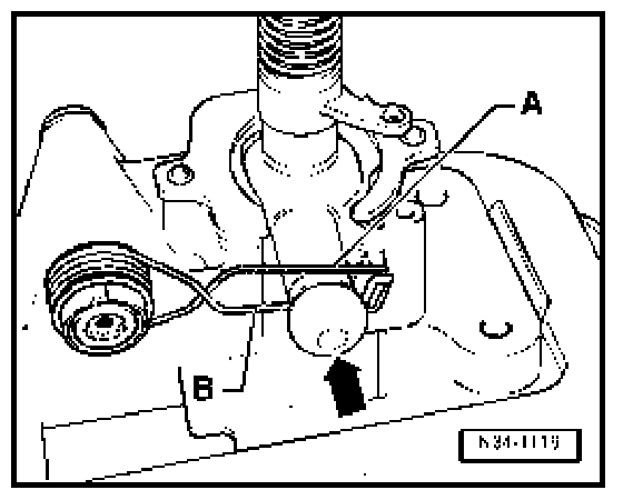 - Pull spring extension -B- down so that it reaches below pin (arrow).