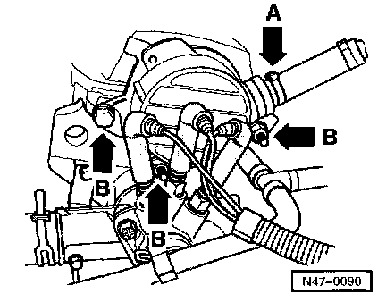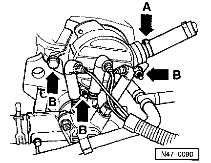 - Install bolts (arrows -B-) on cylinder head flange and secure vacuum hose with clamp (arrow -A-)