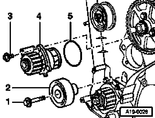 - Unscrew mounting bolts -3- from coolant pump and carefully remove coolant pump -4- between engine bracket and toothed belt guard.