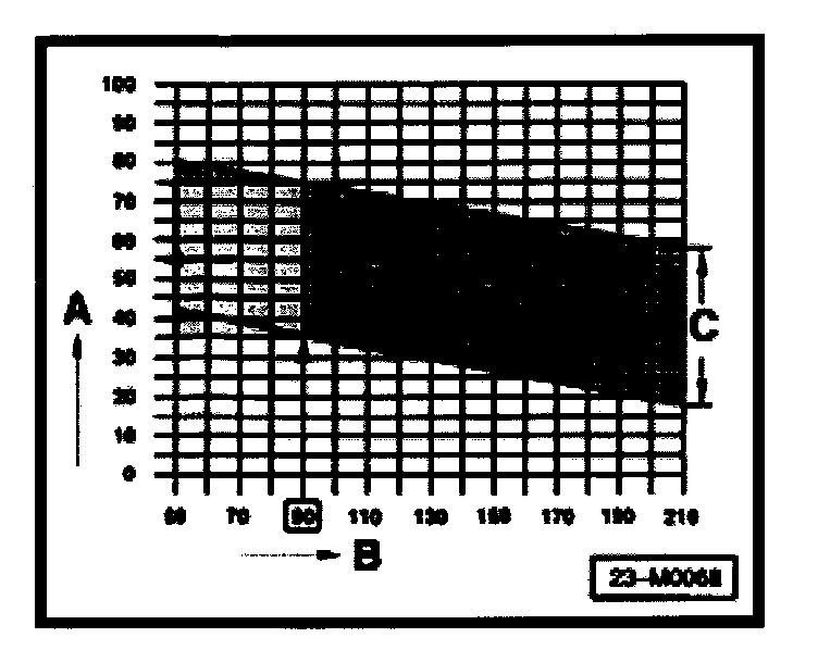 NOTE: If, when checking Start of injection, the specifications are within zone -C-, no adjustment is required. After repairs, e.g. removing and installing injection pump or adjusting timing, Start of injection must be set to the mean value (dashed line) in zone -C-.