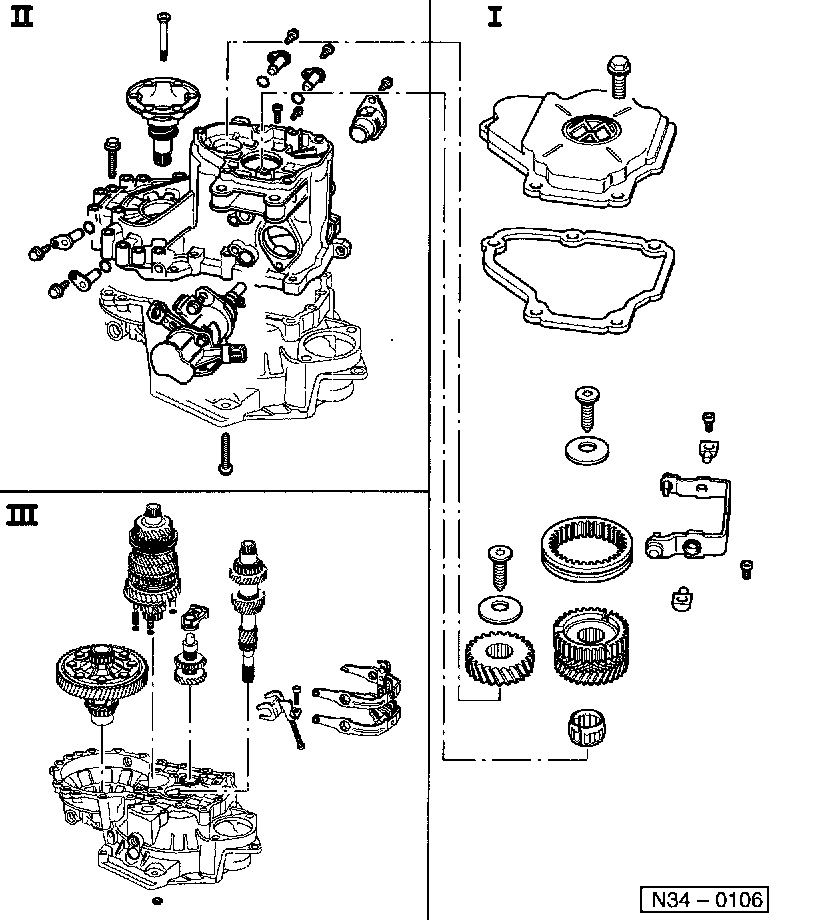 III Disassembling and assembling input shaft, output shaft, differential and selector forks.
