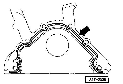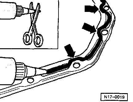 - Apply silicone sealing compound, as shown, to clean oil pan sealing surface. Sealing compound bead must be: