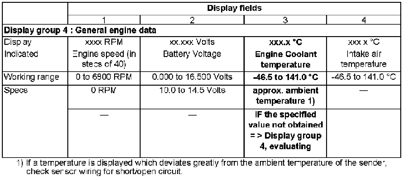 The Engine Control Module (ECM) uses Intake Air Temperature as a replacement value for engine starting (start temperature replacement value) if there is a malfunction stored in DTC memory which affects the Engine Coolant Temperature (ECT) sensor G62. The temperature then rises according to a model stored in the ECM. Shortly after the engine reaches operating temperature a constant replacement value will be displayed. This value is also dependent upon Intake Air Temperature.
