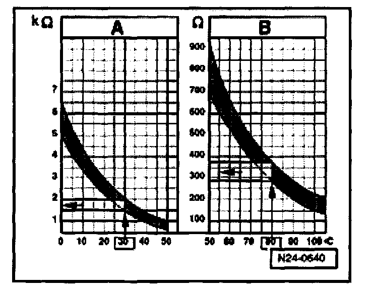 - 30 °C (range A) corresponds to a resistance of 1.5 to 2.0 k Ohms