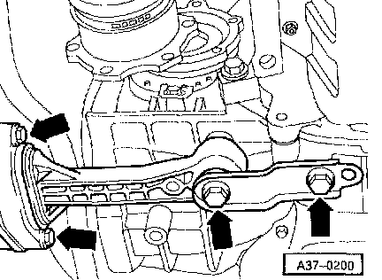 Do not remove bolts for transmission carrier (arrows) until transmission has been supported.