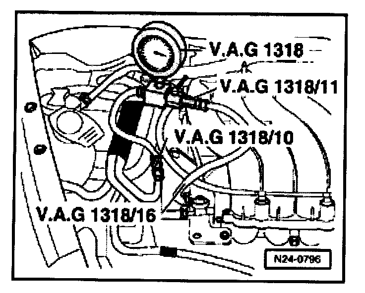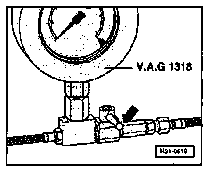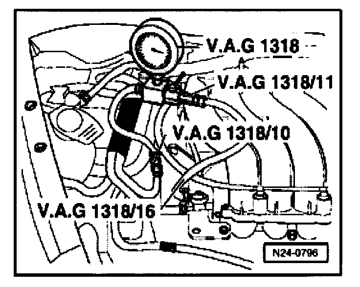 - Connect VAG 1318 pressure gauge using VAG 1318/10, /11 and /16 adaptors.