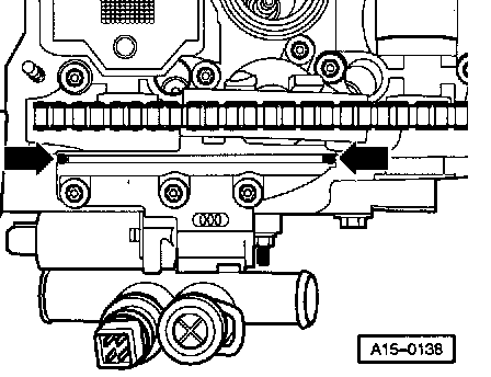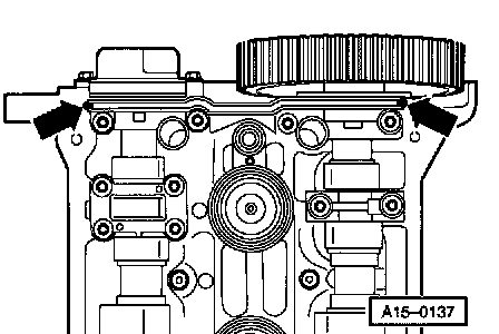 - Carefully apply a thin coat of sealant "D 454 300 A2" to both edges of sealing surfaces between camshaft adjuster and cyl. head -arrows- using a small screwdriver.