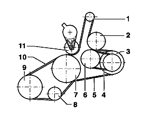 5 - Ribbed belt - generator, viscous fan, power steering pump, crankshaft and tensioning roller. See table column B below.