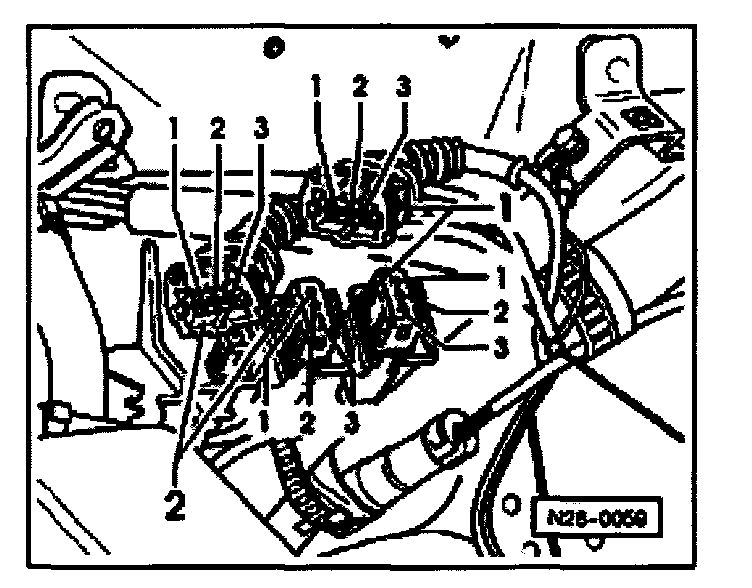 - Disconnect 3-pin harness connector (green) to knock sensor 1 G61 -1- and / or 3-pin connector (blue) to knock sensor 2 (G66) -2-.