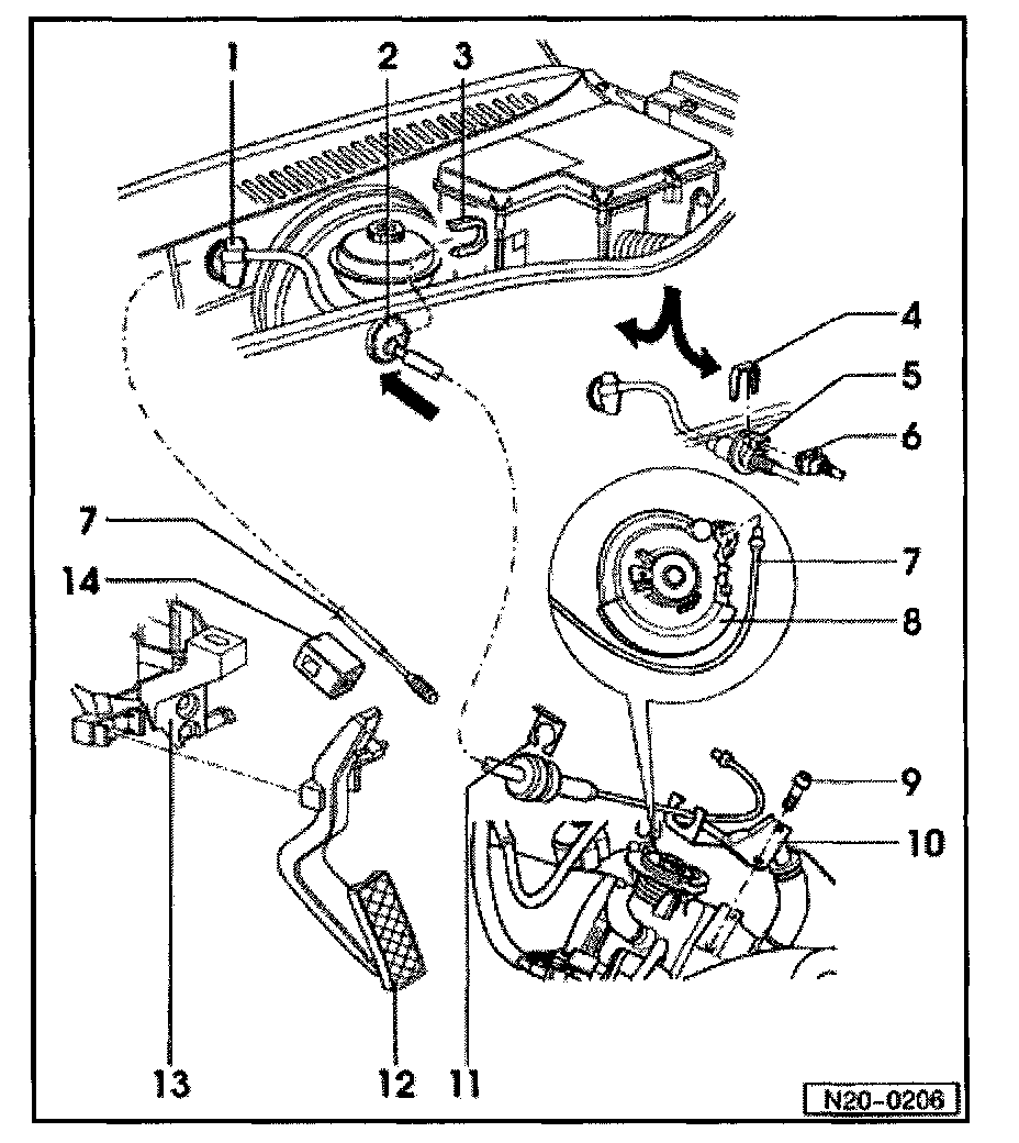 - Push throttle cable through bulkhead in plenum chamber (arrow 1).