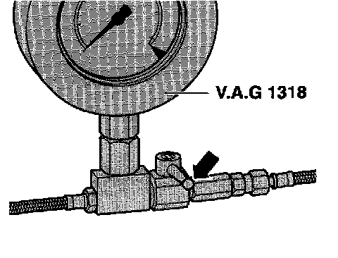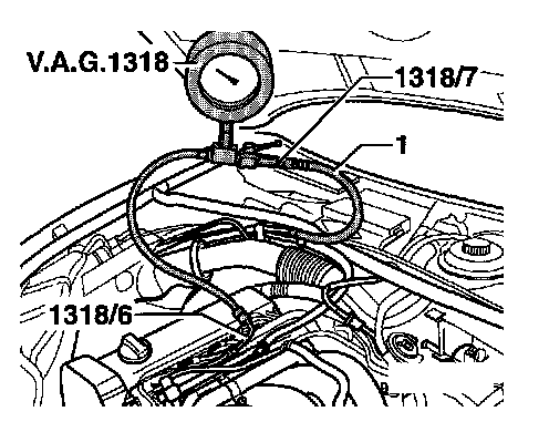 - Connect pressure gauge VAG 1318 to fuel supply pipe -1- and to fuel rail using adaptors 1318/6 and 1318/7.