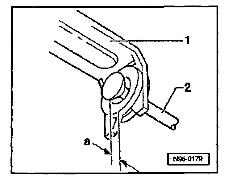 Play -a- between rod -2- and vacuum servo linkage -1- must be between 0.5 mm and 1.0 mm (0.019" and 0.03")