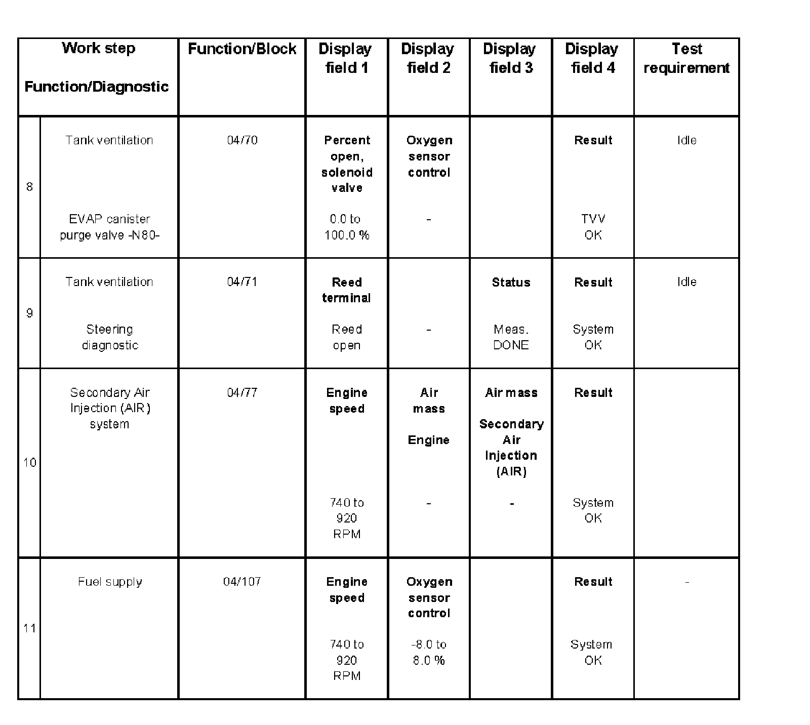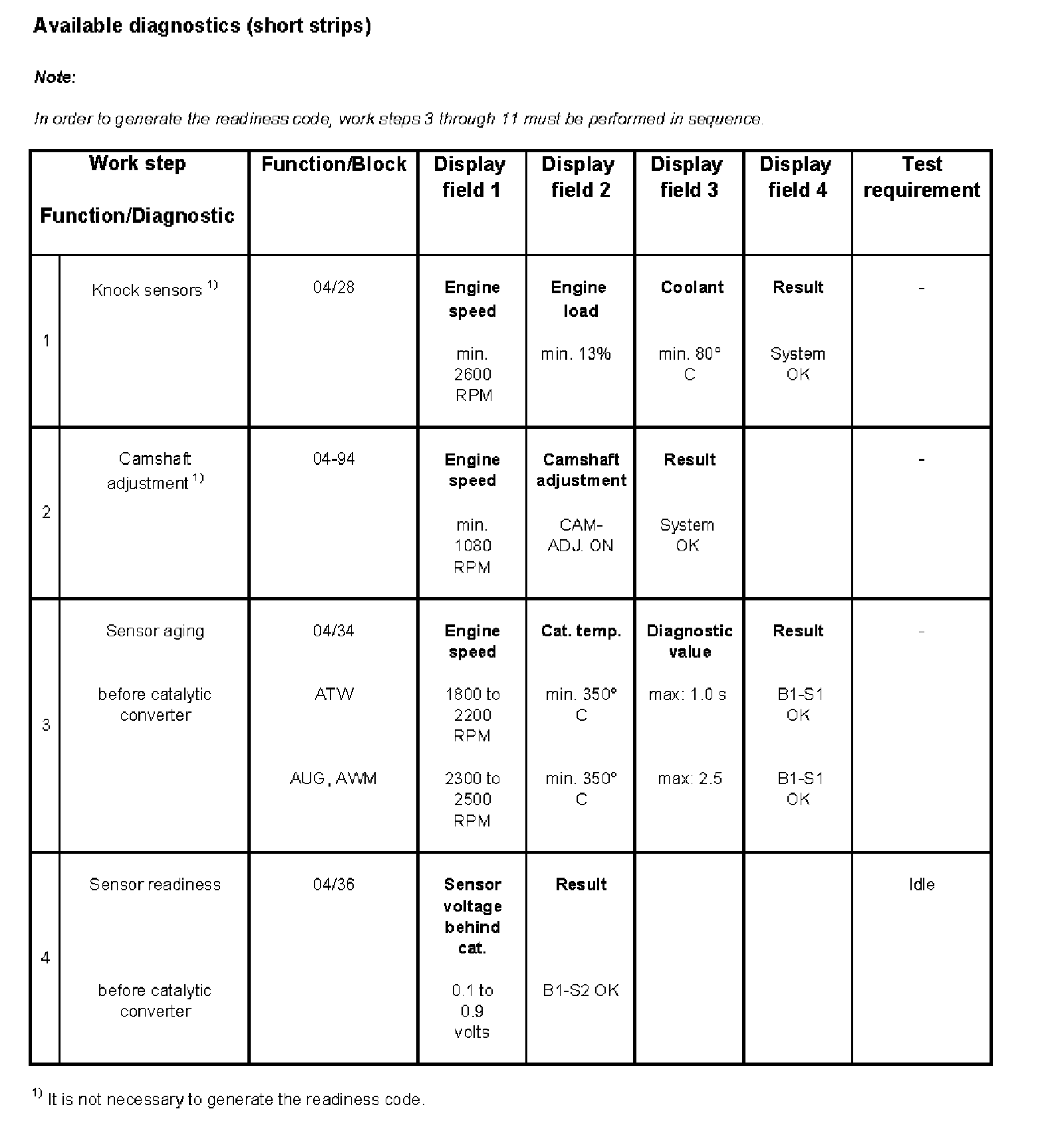 - Coolant temperature must be at least 80 °C, display group 04, display field 3