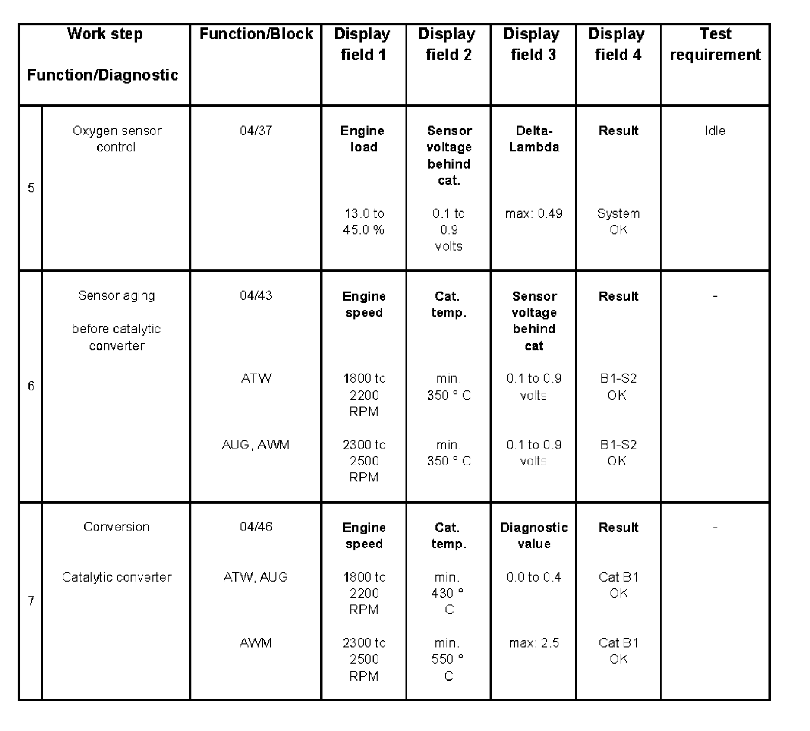 The catalytic converter temperature in display field 2 must be at least 430 °C for engines ATW, AUG; and at least 550 °C for engine AWM.