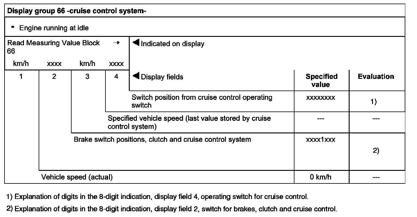 Explanation of digits in the 8-digit indication, display field 4, operating switch for cruise control